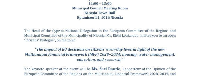 Η Ένωση Δήμων Κύπρου προγραμματίζει τη Δευτέρα, 9 Φεβρουαρίου 2026 και ώρα 11:00 – 13:00, ανοικτό διάλογο με τον πολίτη με θέμα «Ο αντίκτυπος των αποφάσεων της ΕΕ στην καθημερινή ζωή των πολιτών υπό το πρίσμα του νέου ΠΔΠ 2028–2034: στέγαση, υδατικό, εκπαίδευση και έρευνα» στο Δημαρχείο Λευκωσίας.