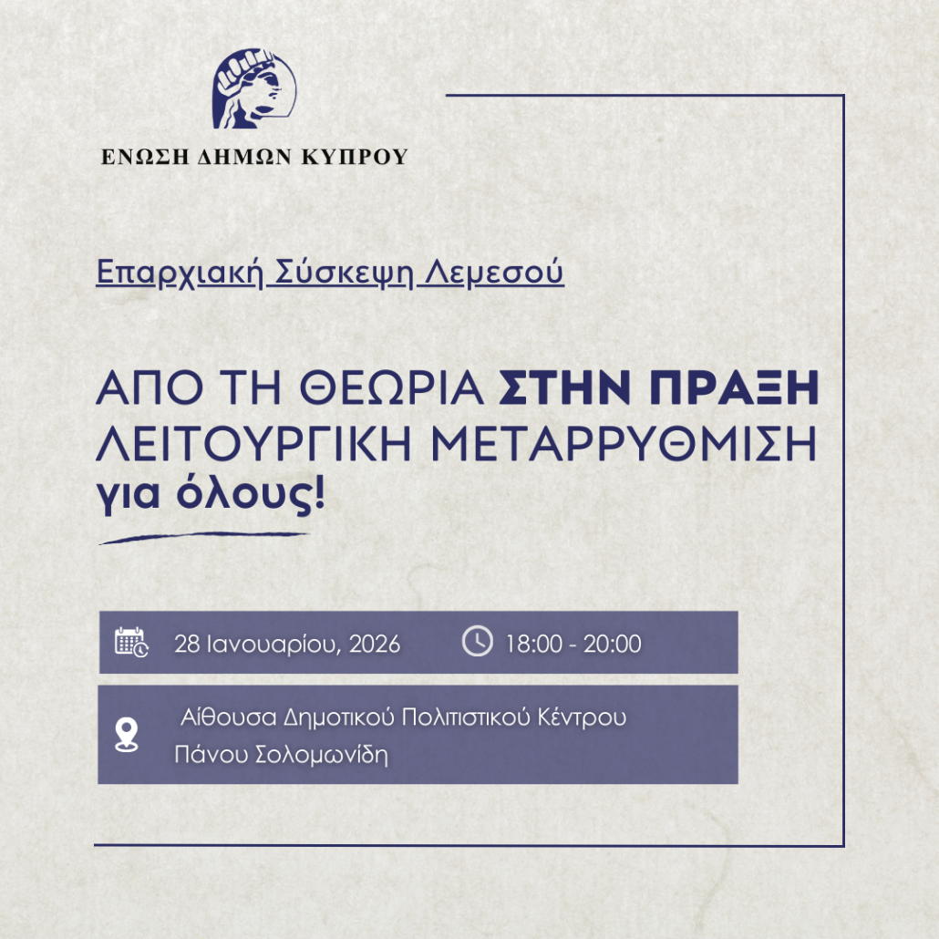Ένωση Δήμων: Πραγματοποιείται αύριο η επαρχιακή σύσκεψη Λεμεσού για τη Μεταρρύθμιση στην Τοπική Αυτοδιοίκηση
